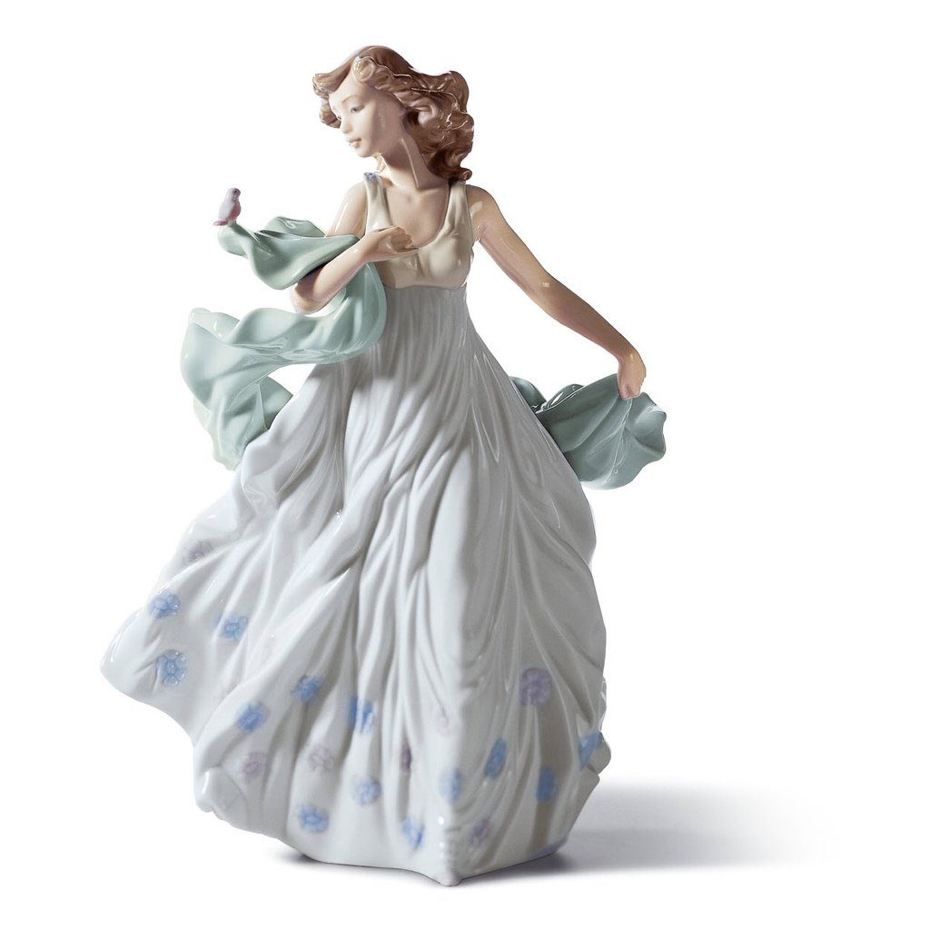 This Lladro Porcelain Summer Serenade is handmade in Spain following a meticulous artisan process used for over six decades. Ah, the sounds of summer! This young lady is wearing a flowery flowing dress and is talking to a song bird that has landed on her green wrap. The highly talented Lladro artisans use the world's finest porcelain to produce stunning creations that move the hearts of thousands of people around the world.