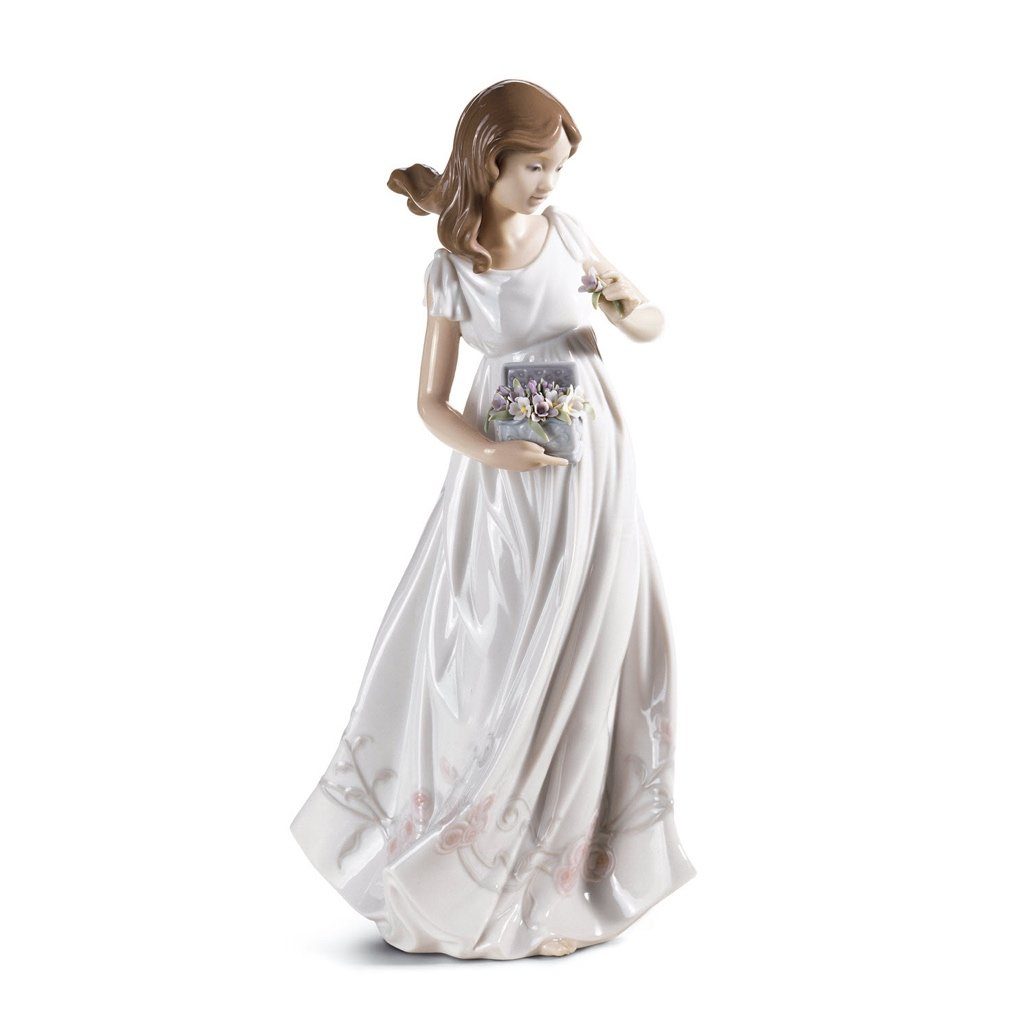 This Lladro Porcelain Treasures Of The Earth is handmade in Spain following a meticulous artisan process used for over six decades. A young girl is holding a boxed bouquet in one hand and a single flower in the other. The highly talented Lladro artisans use the world's finest porcelain to produce stunning creations that move the hearts of thousands of people around the world.